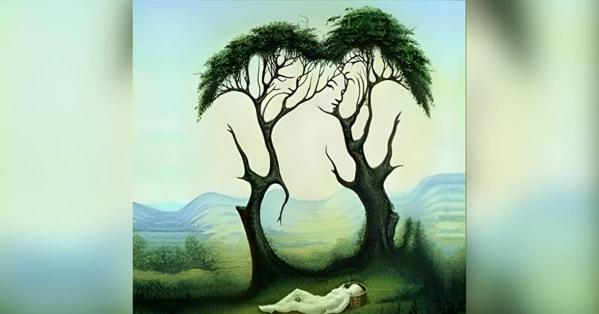 Qual foi a primeira coisa que você viu: as árvore, uma mulher, três rostos, rostos nas folhas, uma pessoa deitada ou a paisagem de fundo?
