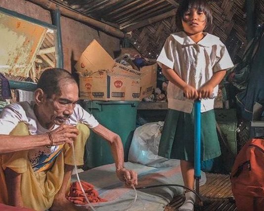 Menina de 6 anos usa bomba de ar manual para ajudar o pai a respirar. Ela não quer que ele morra.