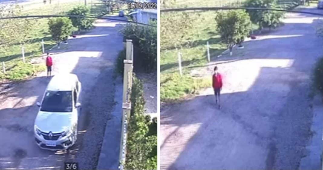 O menino de 12 anos abriu o portão de casa para o pai sair com o carro, fechou o portão, e abriu a porta do carro, mas logo em seguida, fechou sem entrar. Pensando que o filho havia entrado no carro, o pai acelera e segue em direção a escola.